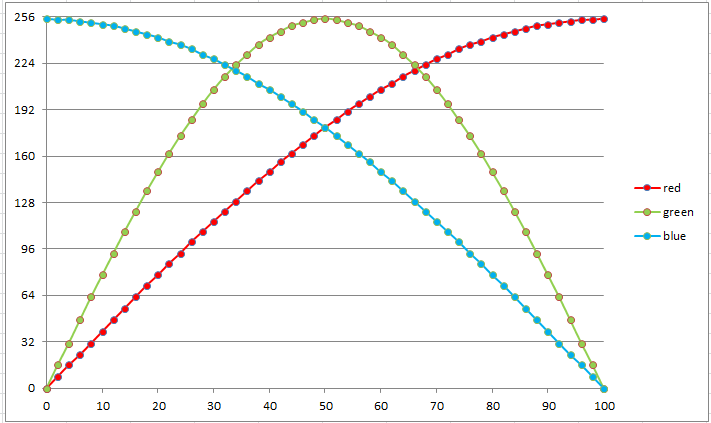 blue = cos(spectrum location / maxLocation * PI/2) * 255