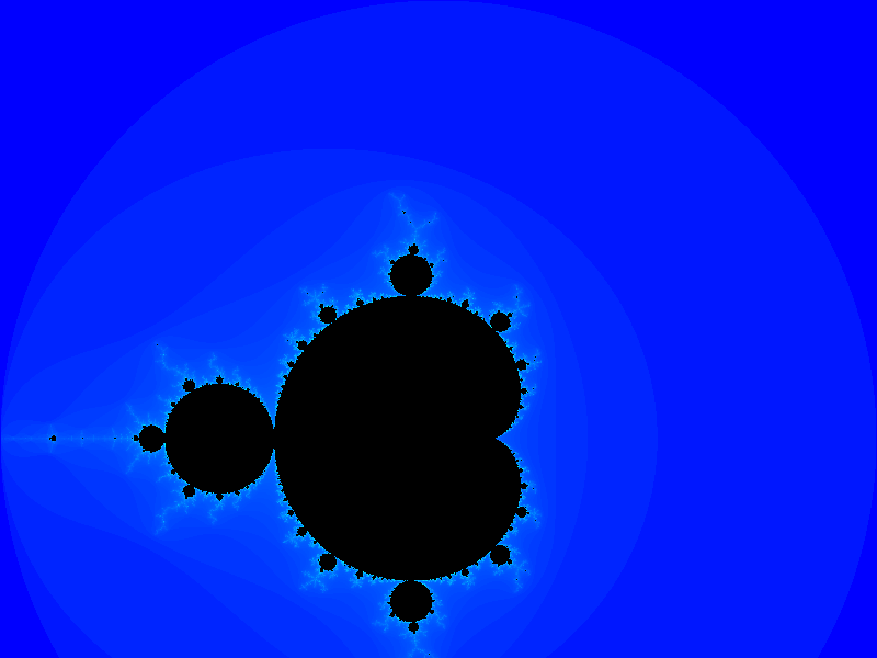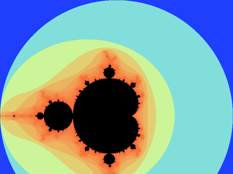 Code is provided in SimpleGradientColorChooser to render points that are in the Mandelbrot set as black. Points that are outside the Mandelbrot set will be rendered using a color that indicates how many times the equation was iterated before the magnitude of Z reached 2.0. In this implementation, the g and b channels will scale logarithmically with the number of iterations.