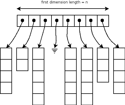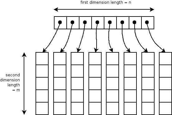 The first dimension of the array is actually a one dimensional array, each element of which is a lower-dimensional array. In this case, the first dimension of the array is an array whose elements point to the columns of the overall 2-d array.